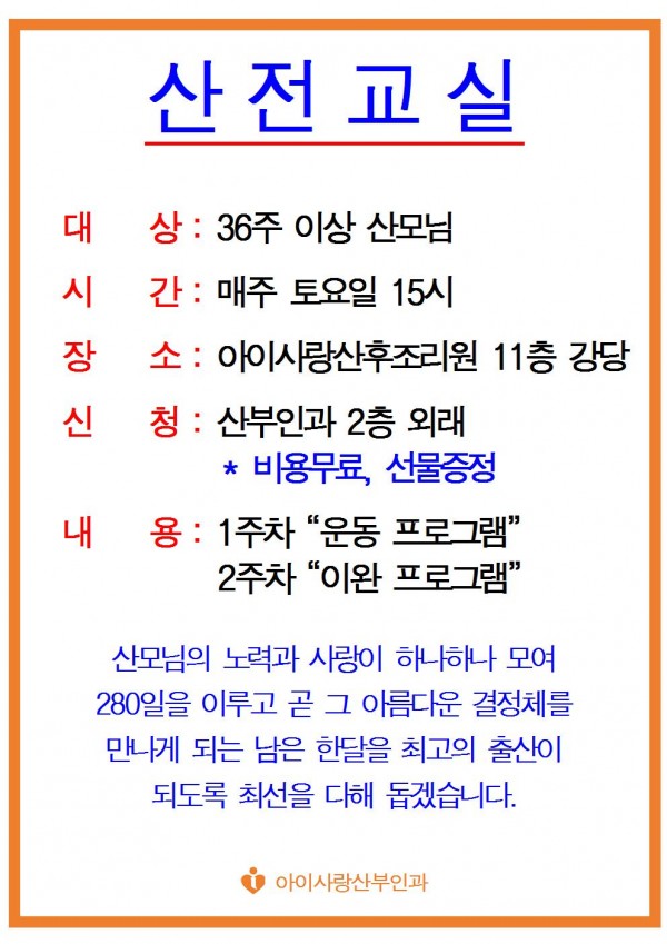 아이사랑산부인과 산전교실(운동, 이완프로그램) 페이지 정보 작성자 최고관리자 작성일19-10-01 16:22 조회4,350회 댓글0건 관련링크 다음글 목록 본문 . 댓글목록 등록된 댓글이 없습니다. 다음글 목록