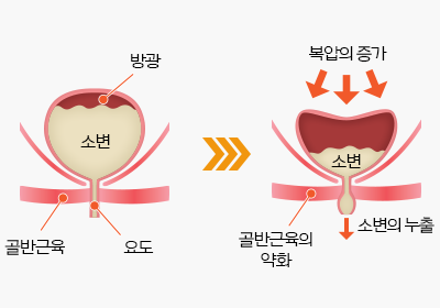 요실금이란 방광과 요도를 탄탄하게 지지해주는 골반근육이 약해지고 골반이 이완되어 방광과