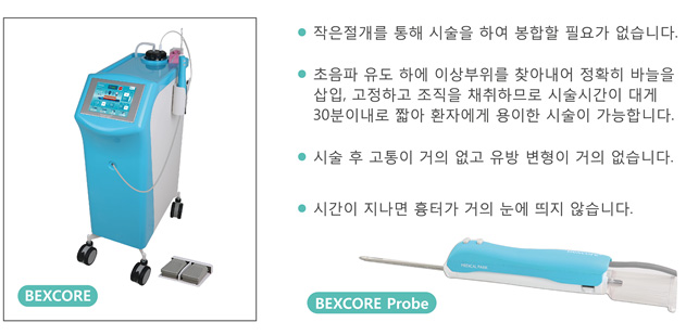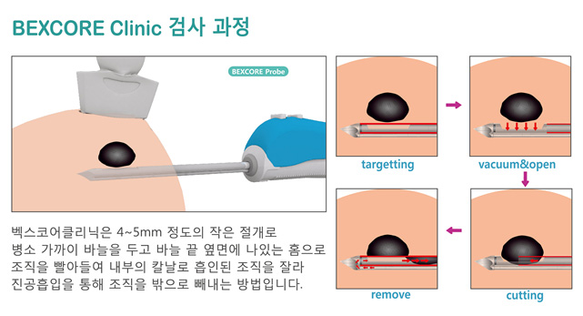 벡스코어는 진공보조유방생검 및 절제술로 유방의 종양을 커다란 절개, 상처 없이 채취하여 조직 검사하거나 제거할 수 있는 첨단 조직 검사 장비입니다.